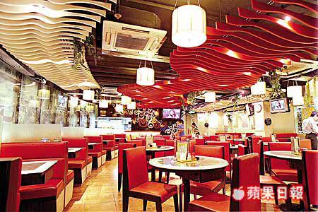 橙紅色的波浪紋假天花,配搭同一色系的厚重高背餐椅,潮氣十足,完全擺脫一貫港式茶餐廳的街坊形象。