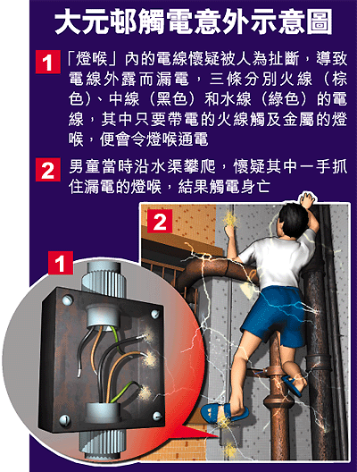 另一方面,由於供電的燈喉是大廈的消防電力裝置,提供警鐘及消防泵所需的電力,房署與消防處和機電工程署已成立跨部門小組調查今次事件。房署昨指出,前晚九時許事發時,十二歲男童陳俊傑是從大元邨泰怡樓三樓走廊攀出大廈外,沿着去水渠攀下,其間可能在抓住旁邊漏電的燈喉因而出事。