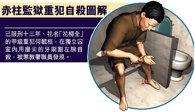 【本報訊】本年初在赤柱監獄服刑期間,涉嫌在太平紳士面前襲擊監獄「一哥」的甲級重犯何毓桓,昨凌晨在囚室內用磨尖的牙刷割腕自殺,幸及時被巡視的懲教署職員發現,送院搶救後撿回一命,現時情況穩定,署方正調查其輕生的原因。 記者:李家傑