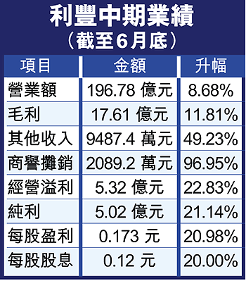【本報訊】利豐(494)昨日公布中期純利5.02億元,較上年同期升21.14%,接近市場預測下限。利豐董事總經理馮國綸承認,全年純利應該不能達到19億元的目標,但預期全年純利及營業額仍錄得雙位數字增長,若集團在年底未進行任何收購,不排除增加派股息以回饋股東。