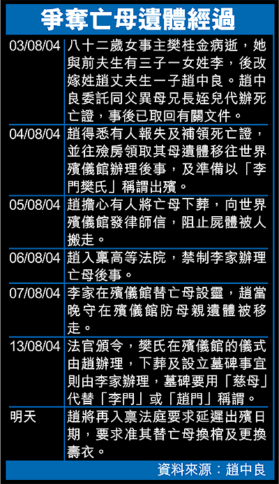 在法庭頒令之後,趙中良昨晚到世界殯儀館準備瞻仰亡母遺容,但殯儀館方面卻以李家經已辦理有關手續,阻止趙進入其母的停屍間。趙表示,他原本計劃讓母親於明日(十六日)設靈及後日(十七日)出殯,並準備了一套價值萬多元的壽衣及新的棺木,但現時連亡母的遺容都看不到,不知如何辦理後事。因此,他準備明日一早再次入稟法庭,要求延遲出殯日期,及讓他替母親換棺及換壽衣。