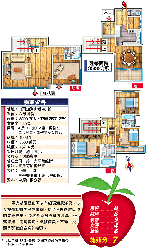 陽光花園只有8年樓齡,屬區內較新的洋房屋苑,為數10座,面積分2300及3500方呎兩類,前排6座面積較大,景觀也較佳,今次介紹放盤坐落單邊,私隱度較高之餘,視野份外開揚。業主於數月前翻新全屋,添置一系列家具電器,質素媲美示範單位,現連逾200萬元裝修及家電放售,叫價5500萬元。