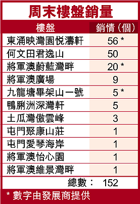 【本報訊】數家大型發展商輪流推盤催谷樓市,平靜數月的一手市場近期再度活躍。不過,熱鬧市況主要集中在新推樓盤上,昨日售出的152個單位中,新推樓盤何文田君逸山及東涌映灣園悅濤軒佔106,佔總數約七成。另外,今日第二輪公開抽籤發售的西灣河嘉亨灣,截止昨日約接獲300個認購登記。