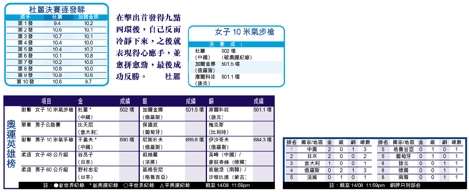 二十二歲的山東姑娘杜麗,不負所託,在女子十米氣步槍中後來居上,以破奧運紀錄的五百零二環奪標,成功為中國奪得今屆雅典奧運的第一面金牌!這亦是今屆奧運的首面金牌,及後老將王義夫在男子十米氣手槍同樣後上奪金,令中國神槍手在今屆奧運「兩發兩中」。