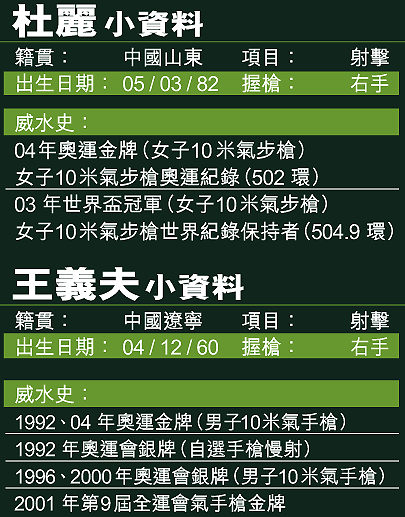 小將開紅門,至於六屆奧運元老中國的王義夫亦不讓杜麗專美,在男子十米氣手槍中,憑着最後一槍打出九點九環,以破奧運紀錄的六百九十環成績,以○點二環反勝俄羅斯的尼斯杜夫,事隔十二年後再次奪金。王義夫在對上兩屆奧運都大熱倒灶,未能奪金,但薑是老的辣,敗而不餒,終於在奧運場上再現風采。