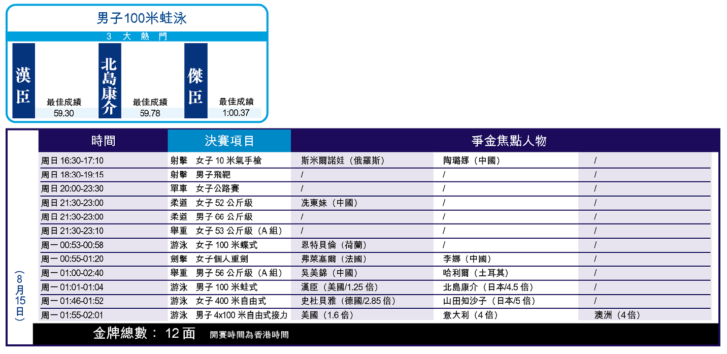 除了男子一百米蛙泳外,男子四乘一百米自由泳接力決賽亦是焦點。大熱門是有新星費斯壓陣的美國隊;而澳洲和意大利雖有一定實力,但料難作出威脅。女子一百米蝶泳,上屆金牌得主荷蘭的貝特貝倫將是金牌大熱。
