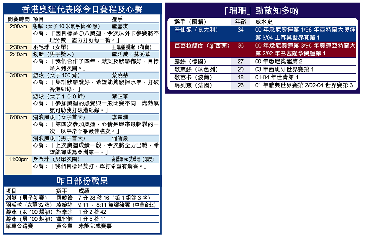 今屆的奧運,分別有三十四男及二十六女參加滑浪風帆項目。今日第一天比賽,希臘當地預測吹北風,時速約每小時六至八海里,亦是「珊珊」較擅長的風速。未知她能否繼兩天前在同一風速的練習賽後,再次在女子組獨佔鰲頭。