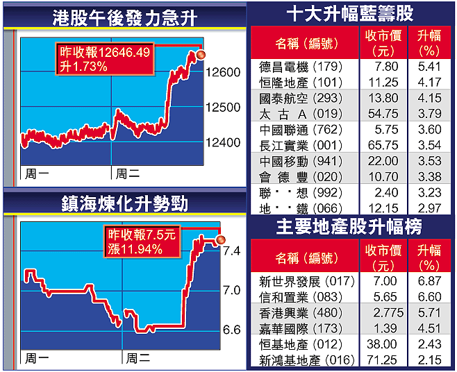 亞太區股市昨早段普遍下挫,港股跟隨輕微低開,一直在12500點以下徘徊,直至午市在期指挾倉盤帶動下,恒指衝破12500點阻力,結束長達15星期的牛皮局面。恒指以接近全日高位收市,報12646點,升214點,成交額增至149.98億元。即月期指更直撲12700點關口,收市報12683點,高水37點,成交合約3.45萬張。