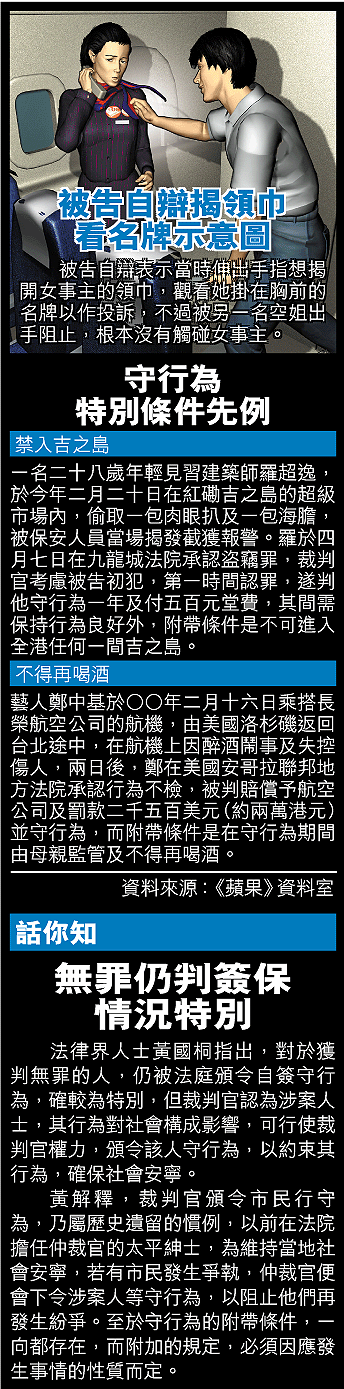 【本報訊】一名台灣籍旅行團男領隊,涉在港龍航機上撥開空姐胸前領巾,被空姐指其非禮,原被控一項非禮罪,昨在荃灣法院審訊中途,控罪修改為普通襲擊,法庭最後以控方未能全面舉證被告心存惡意,裁定罪名不成立。不過,裁判官認為被告的行為不恰當,遂頒令他簽保一千元,守行為兩年,並附加罕見條件,規定被告兩年內不准觸摸任何人的衣物,除非獲得對方同意。 記者:陳浩義、譚暉