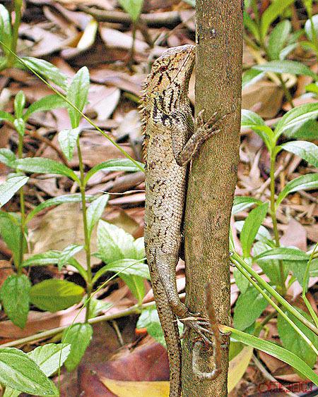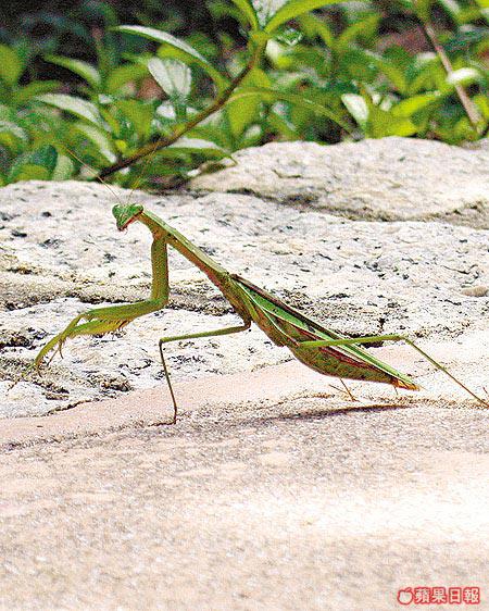 想不到路程短短,卻有幸遇上不少昆蟲和動物。樹上,首先出場的是只在展覽館看過的有型昆蟲龍眼雞,雖身軀細小,但外形和顏色實在太搶眼,就在眼角一瞥、千鈞一髮間吸引到我的注意;路中心,又遇上通體啡綠的大螳螂擋路,嚇得郴妹先止步兼即時回跳兩步,此舉令Johnny雄性荷爾蒙激增,耍起不知何時學來的騎呢螳螂拳與之對峙,嚇得螳螂大哥火速逃走;最後是變身樹蜥,一動不動懶理人,態度好囂張。