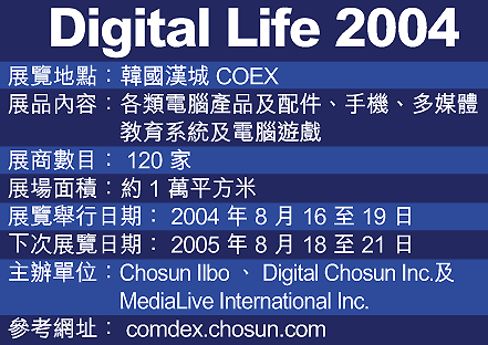 雖然「DigitalLife2004」的展商數目只有120家,規模算不上是國際性的大型電腦科技展覽,但若想一睹大韓民族的科技創意,相信這個展會不會令你失望。事實上,DigitalLife2004的原名為COMDEXKorea2004,為了與群眾拉近距離,這個原本只供業界人士參觀的展會,在今年一連4天的展期中,特別將2天開放予公眾參觀,故場內展示的產品更見生活化。