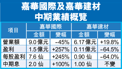 同系公司嘉華建材(027),中期盈利倒退64.5%,至1106萬元;每股派中期息1仙。呂志和表示,雖然本港經濟已開始復甦,但建材行業因滯後因素,上半年表現未見理想。不過,內地惠東大亞灣之預拌混凝土業務已開始獲利;該公司亦於上月在昆明投資水泥及礦渣微粉廠。期內嘉華建材營業額上升19.8%,至6.17億元;每股盈利0.9仙,跌64%。