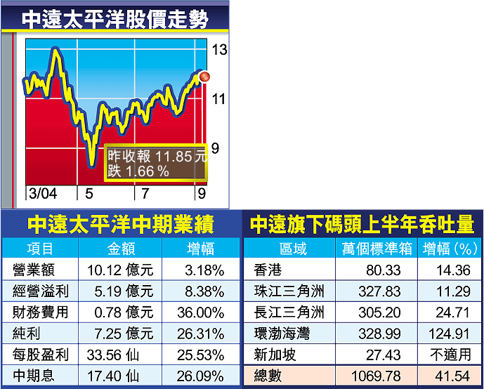 【本報訊】中遠太平洋(1199)公布,上半年純利增長26.31%,至7.25億元,符合市場預期;中期息17.4仙,派息比率維持約52%。常務副主席劉國元表示,目前香港貨櫃碼頭的處理能力仍有增長空間,估計要8年後才飽和,故對現階段提出興建10號貨櫃碼頭存有疑問。該公司昨中午公布業績後股價出現回吐,收報11.85元,跌1.66%。