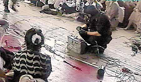 俄羅斯人剛從別斯蘭市學校死傷枕藉人質慘劇中收拾悲痛心情,當地獨立電視台NTV周三播出一段震撼人心的錄影片段,把相信是槍手在體育館內挾持人質首天第一小時所拍攝到的情景展現人前,影帶所見,逾千名人質擠滿體育館,槍手則在人堆中接駁炸彈,地上血迹斑斑,顯示有人受傷或被殺。