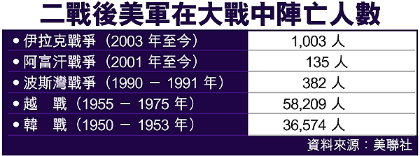 美軍在伊拉克的陣亡人數突破一千大關。隨着過去四天共有十七名美軍喪生,由去年初攻伊戰打起至今,攻伊和駐伊美軍陣亡人數已增至一千零三人,比九一年波斯灣戰爭陣亡人數多兩倍,當中八百六十五人更是在總統喬治布殊去年五月宣布大型戰鬥結束後的游擊戰中死去。直至今天,伊拉克游擊戰未靖,美軍恐怕有更多人殉職變成英魂。