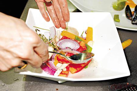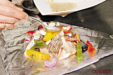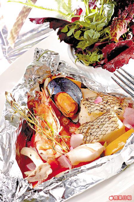 師傅今日示範的錫紙焗海鮮,如果選用新鮮的海產,可以省卻炒香海鮮的步驟。至於海產種類,可以揀選自己喜歡的,但要注意海鮮的受熱程度必須相若,或將海產切粒,否則可能會一些生一些熟。而煮香料的方法跟中菜不同,香料不用預先炒香,否則香味會在炒的過程中完全釋出,即使再焗都不會有香味。所以只要將香料、白酒和海鮮以錫紙包裹,放入焗爐,香料的香氣就會被逼出,所有香氣和鮮甜都封存在錫紙內,原汁原味。更開心的是連碗都不用洗,懶人就最喜歡。