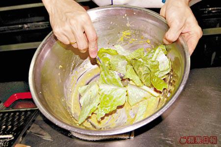 1.一棵法國羅文菜最外面的菜葉要丟去,選內層較淺色的菜葉較嫩。要以手代刀搣菜,防止菜葉變黃。
