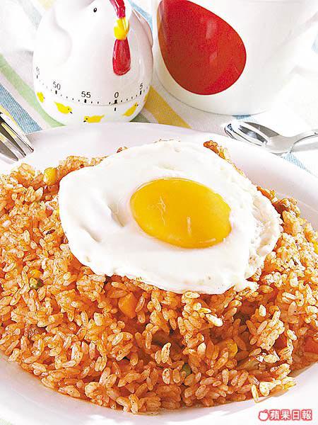 雞肉、提子乾、粟米粒炒飯,加入茄汁(另有咖喱口味),上有一隻晨光早蛋,人見人愛。