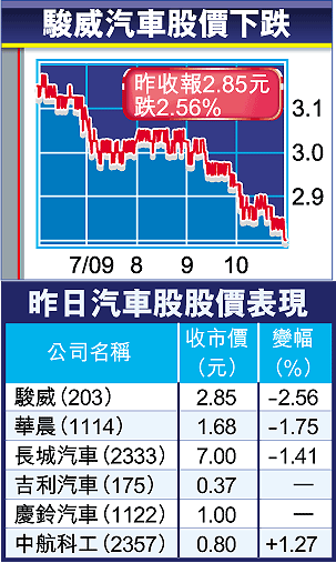 【本報報】剛於周一加入為恒指成分股的駿威汽車(203),昨受到旗下廣州本田公布8月汽車銷量較7月下跌23.63%,及面對減價戰的消息影響,股價一度下挫4.27%,收報2.85元,跌2.56%。據內地有關部門統計,8月全國汽車庫存已累積達40萬輛,踏入9月已有逾20款轎車及四驅車(SUV)降價促銷。
