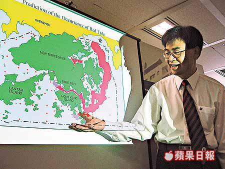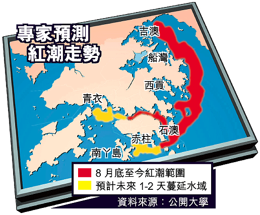 他指出,八月底開始的紅潮,由東面水域吉澳一直南下,至西貢清水灣一帶,再進入維港及港島以南水域。他稱近日量度西面水域的海藻數據,已接近爆發紅潮的水平,每公升水含八百五十粒海藻,科學界以一千粒海藻訂定為紅潮爆發,預計深井、青衣及馬灣一帶未來一至兩天會出現紅潮。他又估計南區的紅潮亦於一至兩天飄到南丫島。他提醒這些地區的漁民要作好準備。
