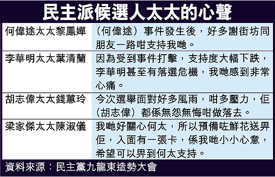 【本報訊】自何偉途被指嫖妓事件後,立法會九龍東選情隨即出現翻天覆地轉變,與何偉途一起參選的民主黨李華明團隊,支持度如坐過山車由高位下跌。民主派九龍東候選人昨傾巢而出支持民主黨,其中梁家傑、李華明、胡志偉三人的太太到場打氣,更一度為夫落淚,場面感人。何偉途太太雖因病缺席,但透過李華明太太說出心聲,表示多謝市民、街坊及民主黨對她和家人的支持和尊重,並希望李華明等可順利當選。 記者:莫劍弦