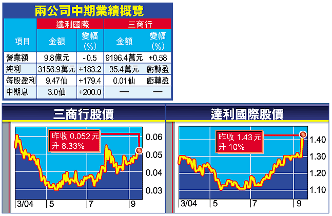 另外,三商行母公司達利截至6月底止中期盈利3156.9萬元,較03年同期升1.8倍,原因是期內毛利率改善,及來自零售業務之虧損減少。半年營業額約9.8億元,與上年度同期相若。