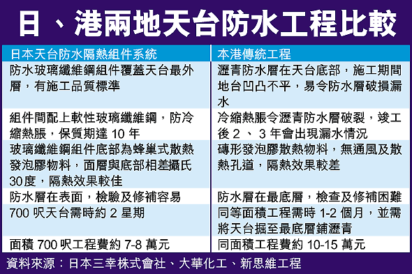 【本報訊】舊樓天台日久失修滲水見怪不怪,惟數百萬元簇新豪宅的天台竟也漏水。有工程師直指,本港傳統天台防漏工程在天台凹凸不平的底部鋪瀝青,防水層易破損兼修補困難,故最近從日本引進最新的「玻璃纖維鋼組件」,鋪設在天台最外層,不但有效防水隔熱,施工及修補容易,工程費也便宜至少三成。 記者:蔡朗清