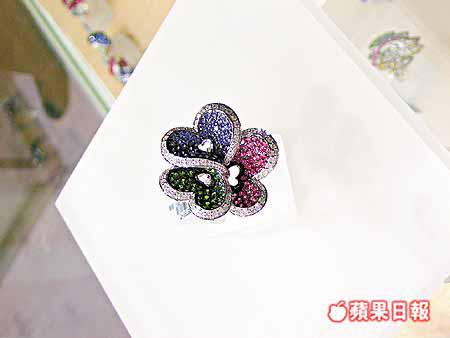 不要小看這隻小小的18K白金戒指,它身上鑲了3種寶石,包括藍寶石、粉紅藍寶石和綠石榴石,出口價約1萬港元。
