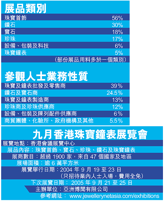 每年9月舉行的「香港珠寶鐘表展覽會」,是全球3大珠寶業盛事之一,而且是亞洲區內最大型的同類型展覽,規模非常具「睇頭」,今年參展商數目超過1900家,來自47個國家及地區。各式最新款的珠寶首飾及鐘表也可在場中尋獲,故吸引全球買家前來購貨。