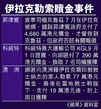 外國保安專家指出,武裝分子較早前成功透過綁架人質迫使菲律賓軍隊和多個外國機構撤出伊拉克,達到政治目的之餘,還暗地裏收取贖金。