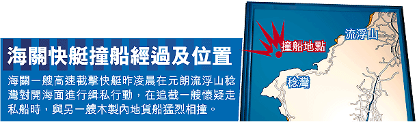 【本報訊】元朗流浮山稔灣對開海面昨凌晨發生撞船意外,海關一艘高速截擊快艇在追截一艘懷疑走私船時,與另一艘木製內地貨船猛烈相撞,兩名內地船員墮海獲救,一人重創而同伴則輕傷;另外快艇上兩名男女關員亦受輕傷送院。肇事高速截擊快艇上雷達疑未能探測到內地貨船,加上木船未有開燈行駛,引致兩船黑夜中相撞,海事處正調查撞船意外真正原因。 記者:區恩傑、林榮江、梁瑞帆