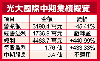 【本報訊】光大國際(257)公布,截至6月底止中期純利增4.41倍,達4483.7萬元;每股盈利1.76仙。由於3月初已完成削股本抵減累積虧損,董事局議決派發中期息0.4仙,為光大國際自1997年後首次恢復派息,派息比率22.73%。公司執行董事兼行政總裁陳小平指出,下半年業績增長主要來自環保業務,現正於常州、深圳、北京及成都展開初步磋商,研究新的環保投資項目。