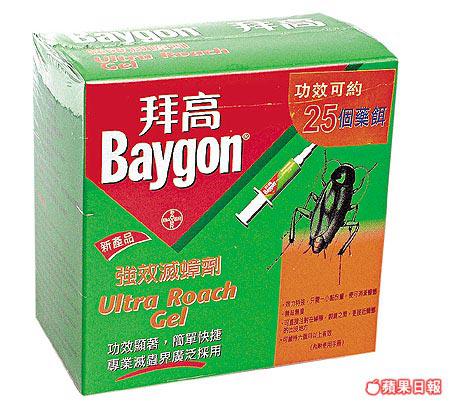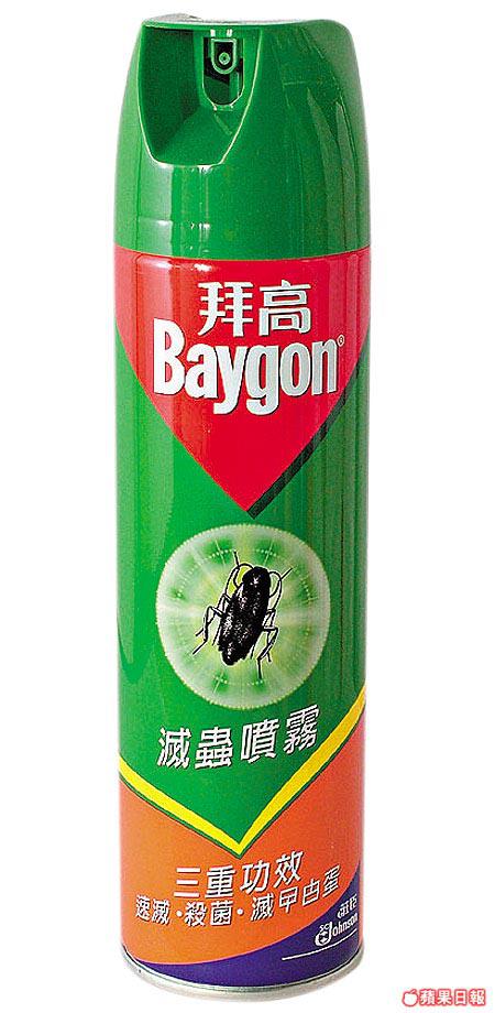 拜高滅蟲噴霧含特效成份,可滲透入曱甴蛋殼內,將孵化中的曱甴、懷孕曱甴徹底殺死,同時可將殘留的細菌如大腸桿菌及金黃葡萄球菌等消滅,達至徹底滅絕功效,效力可維持一個月。每支容量為450ml。
