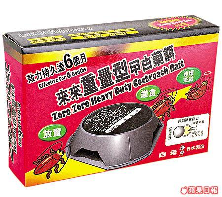 這款來來重量型曱甴藥餌,將微型藥囊藏於曱甴嗜食的餌內,曱甴一經進食,藥力即時生效,密封式的藥囊外層可防止藥力揮發,有效期長達半年。一盒四個,盒內附送貼紙,可將藥餌貼在牆上。