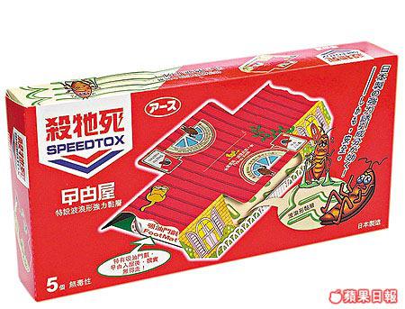 殺牠死曱甴屋,屋前特設吸油地氈,當曱甴經過時可將其腳上的油污及水份吸乾,讓曱甴腳與波浪形貼紙黏得更緊,屋頂有兩種高度調校,適合不同大小空間,有效期為三至四星期,一盒五個。