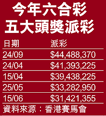 另外,下期六合彩攪珠明日舉行,是歷來首次在周日攪珠,原本在上周日(九月十二日)舉行首次周日攪珠,但由於當日六合彩頭獎基金高達七千一百萬,結果馬會將攪珠延遲兩日,即十四日舉行,最後由七位幸運兒瓜分彩金,每人獲派一千零二十四萬。