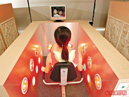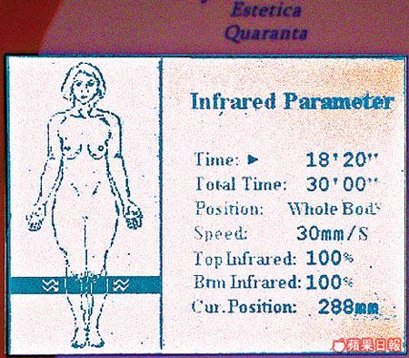 走進房間內,4種光不停的閃呀閃,還以為走進了Disco。這部儀器是利用會移動大型圓輪,透過7個紅外線光環輸出紅外線,波長由750-1,500nm(奈米),使皮膚深層的溫度上升,微細血管擴張,加速血液循環,減少脂肪積聚,達到瘦身效果。