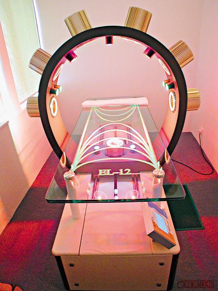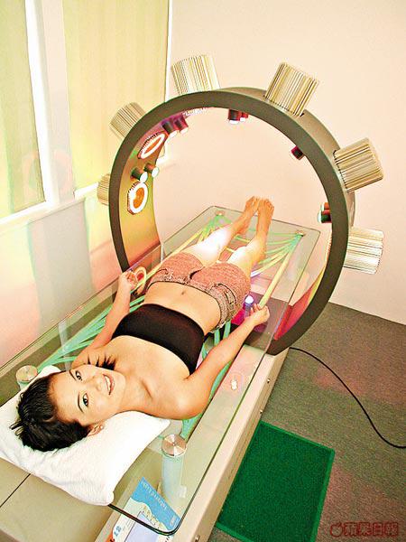 所放射的紅黃藍綠光,照射人體7個分布於脊椎、肚臍、胸口、喉嚨的能量點,瘦身之餘進行色光治療,更可達至舒緩、鬆弛神經及增強能量。圓輪由小腿移至肩膊,也可停留在某一部位,如肚腩難減的部位作重點收身。只要躺在玻璃床上,從正面、背脊都顧及得到,每次使用半小時,便可消耗600-900卡路里,差不多等於做了2小時運動的成果。
