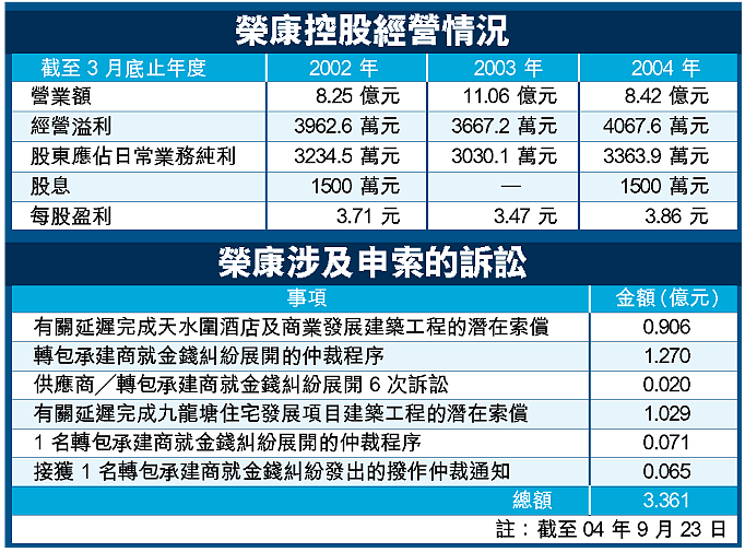 【本報訊】有長實(001)「御用」承建商之稱的榮康控股(745)昨公開招股,按招股文件顯示,涉及的法律訴訟索償金額3.361億元;近兩年總營業額中,超過60%來自單一客戶。
