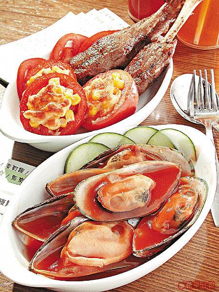 三巴青口的味道類似用蠔油烹煮,雪藏貨嘗不到鮮甜味,但大大隻夠𡁻頭。燒豬仔髀食落啖啖肉,特別過平時燒烤食雞髀。金粟釀鮮茄用料普通,但粟米上面放了芝士一齊焗,芝香好滋味。