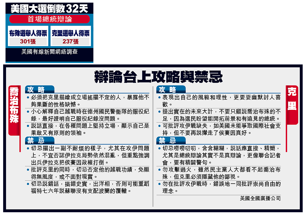 於香港時間今早九時,美國首場總統電視辯論掀開戰幔。在九十分鐘的滔滔雄辯中,競選連任的美國總統喬治布殊和他的民主黨對手克里,第一次同台較勁,在五千萬美國觀眾前,比拼國家政策立場、領袖風範、台型等。舌戰前夕,兩人更已在宣傳戰上交鋒,互數對方不是。克里指喬治布殊「隱瞞失敗」,揚言在辯論時向國民披露「真相」,喬治布殊陣營繼續批評克里搖擺不定。