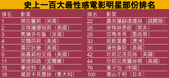 英國著名電影雜誌《Empire》剛透過讀者投票選出「史上一百大最性感電影明星」,現年十九歲的英國女星姬拉麗莉(KeiraKnightley),力壓一眾荷李活巨星勇奪冠軍。內地女星章子怡亦有幸成為三位上榜的亞裔女星之一,在榜中排名第七十六。