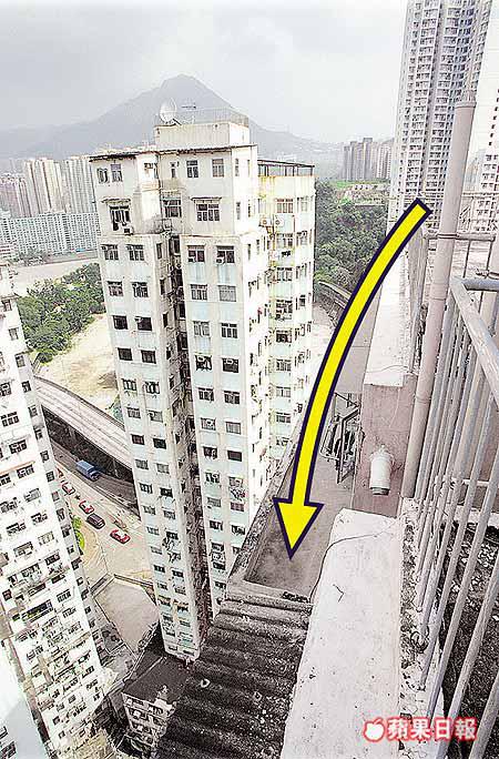 溫婦講述事件經過稱,昨晨九時許買餸回家,赫見一名女子站在窗外四呎闊的石屎簷篷,第一時間以為對方是賊,高聲呼喝,不料對方幽幽地道:「我想跳樓。」仔細一看,果然見她手腳擦損,一臉茫然若有所失,相信她由其住所對上天台躍下跳樓,只是命不該絕跌在簷篷而已,慌忙致電報警。