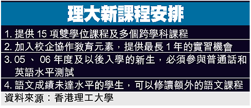 為了解學生的語文水平,○五、○六年的理大新生必須參與校內的普通話及英語水平測試,成績共分為九級,有關成績不會印於成績表上;若學生選擇報考國際英語測試(IELTS),可豁免考校內的英語試,而語文成績未達標準的學生,則可以修讀額外的課程。該校將於本星期六舉行教育資訊日,介紹來年提供的課程,查詢可致電:23330600。