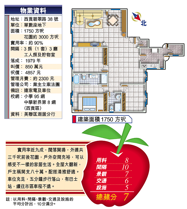 麗莎別墅少放售也少成交,年初才有個山景的地下連花園單位,以550萬元易手,呎價僅3143元。