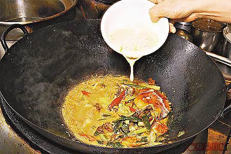 張師傅入行多年,單是專注做泰菜也有十多年。說起泰國菜,張師傅說口味有點偏甜,所以都需要略略調整。今次他示範的兩個都是較傳統的泰國菜。咖喱炒蟹只取其香,用咖喱粉並不太多,最重要反而是上碟前加入泰國辣油,把顏色和辣味帶出,令到味道更香和惹味。張師傅說除了用膏蟹,用肉蟹或其他蟹都可以,同樣能帶出鮮味。