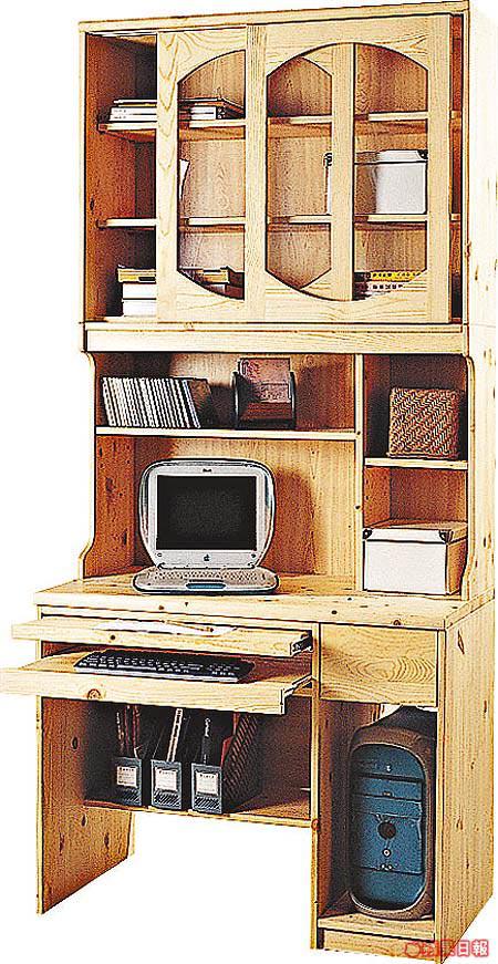 美國松木書枱組合,設有兩塊拉出式層板,可分別用來做寫字枱及放鍵盤,方便實用。主機及文件夾可放在枱下的活動式層格,書枱頂的書架設有雙趟門,避免書本封塵。