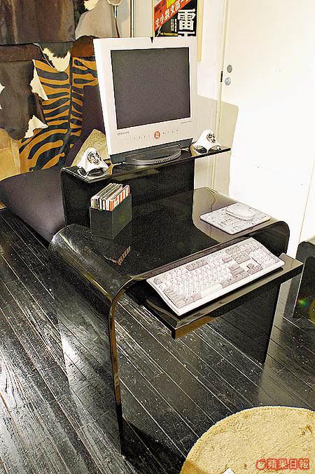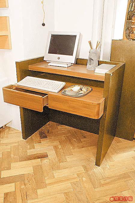外形設計特別,簡約具流線型,體積細小慳位,可提高空間感。層板可用來做書架,亦可放電腦顯示屏,附有拉出式層板放鍵盤,全張以木製成。