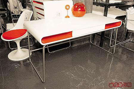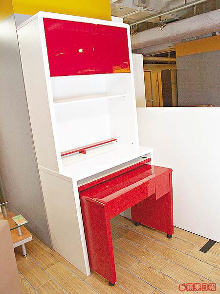 闊大枱面下分成三格,除中間一個抽屜為密封式外,兩側均採用開放式設計,感覺就像學校的舊式書枱一樣,可便於存取文件或書本。紅白色調配加一身圓滑造形,簡約前衞。