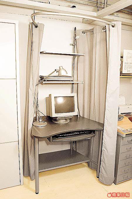 這款簡單的書枱組合最適合放在角位,下層層板可放文件,上層活動層板可調校不同高度及距離,拉出式面板可放鍵盤,頂部更裝有軌道及簾,不用時可將簾拉上。